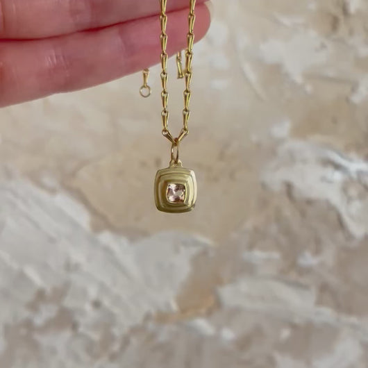 Named after the ancient ruins in modern day Iran, this one of a kind Persepolis Pendant features a peachy square cut imperial topaz set in 18k yellow gold. The design, with its three-tiered bezel setting modeled after the ruins themselves, is finished matte with a squared wire bail. The Persepolis collection is rustic in nature, so that it feels as though you have dug up the gems from an archeological dig at the site yourself.