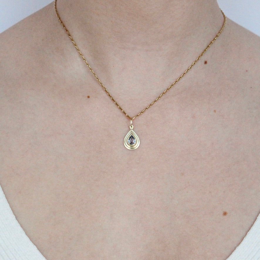 Named after the ancient ruins in modern day Iran, this one of a kind Persepolis Pendant features a light blue pear cut sapphire set in 18k yellow gold. The design, with its three-tiered bezel setting modeled after the ruins themselves, is finished matte with a squared wire bail. The Persepolis collection is rustic in nature, so that it feels as though you have dug up the gems from an archeological dig at the site yourself.