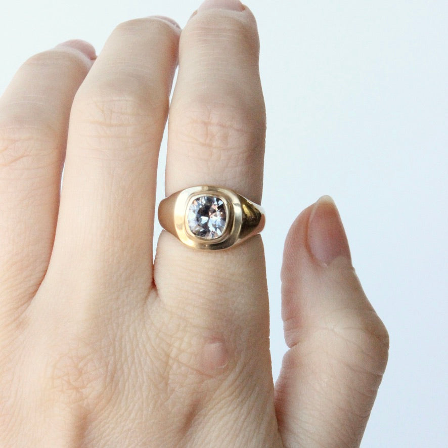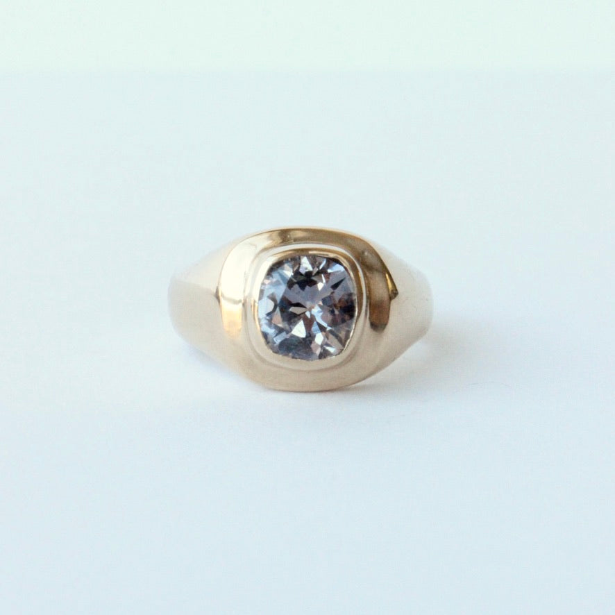 The Persepolis Signet Ring is a modern interpretation of a classic gemstone signet, and features Talāyee's iconic tiered bezel design. A comfortable everyday ring that is sure to become your signature piece. Choose your gemstone from the drop-down below to be set in 14k gold and finished with our soft matte finish. There is only one of each gemstone, so each ring is one of a kind. Once your order is placed we will reach out to confirm your size!